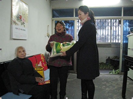 图:孤寡老人接过我们的慰问品,开怀笑颜
