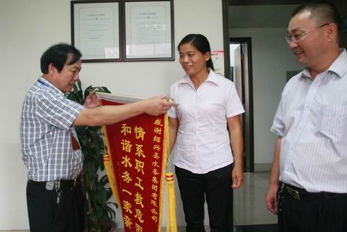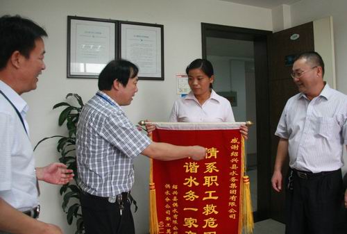 这些爱心捐助使莫煜君深深感受到水务大家庭的温暖和关怀。为表示首页工会对她的帮助和关爱,送上大红锦旗,面谢工会雪中送炭之情。