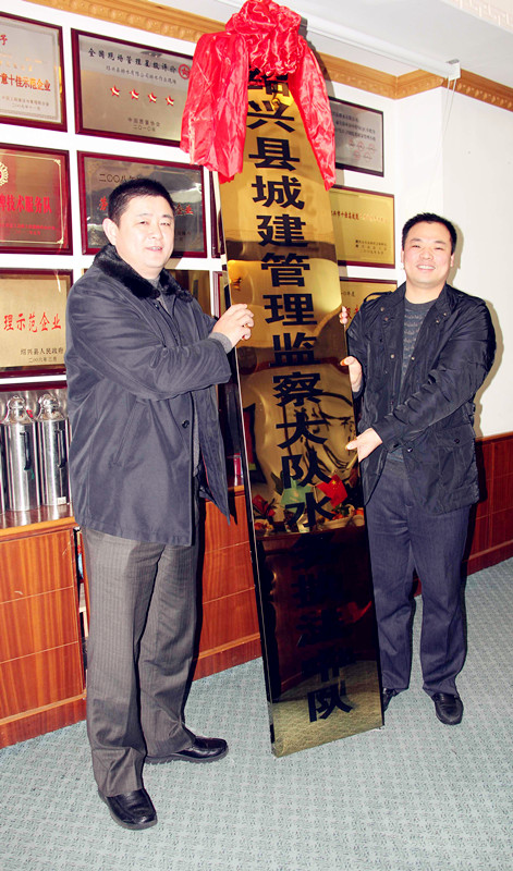 ,绍兴县城建管理监察大队水务执法中队成立授牌仪式在排水公司举行。县城管办副主任许立人、首页公司副总经理冯梁峰等领导参加仪式。