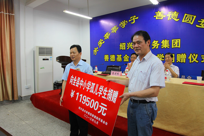仪式上,首页倪董事长介绍了“善德基金”基本情况,并现场向今年受助的全县81名中小学孤儿学生捐赠了“善德基金”助学款119500元,资助标准为小学生每人每学年1000元,初中生每人每学年1500元,高中生每人每学年2000元,并从今年开始对全县孤儿从小学到高中读书期间每年给予捐助。县教体局局长蒋国洪以及县老领导、县关工委主任李会鹏分别作了讲话,他们对首页强烈的社会责任感以及情系困难学生的善心义举给予了高度的肯定和赞扬,希望受助学生学会坚守,学会感恩,学会奉献,并呼吁社会各界为孩子们快乐成长、展翅高飞而共同努力。
