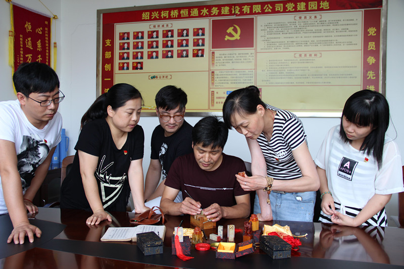 为进一步推进两学一做学习教育,日前,恒通水务建设公司党支部组织党员以党在人民心中为主题进行书法、篆刻创作,广泛地吸引了党员干部参与。图为公司职工金伟勇在向党员们传授篆刻的窍门。