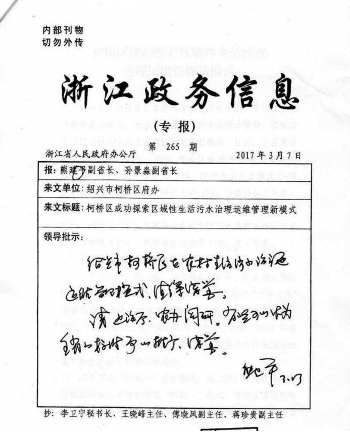 3月7日,浙江省副省长熊建平对《柯桥区成功探索区域性生活污水治理运维管理新模式》进行批示,认为柯桥区在城乡生活污水治理运维管理模式值得借鉴,部分经验可以作为全省的标准予以推广、借鉴。