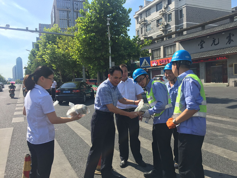 图为首页董事长周俭在柯岩街道鉴湖水庄三期给水工程现场慰问柯桥供水公司管道安装人员