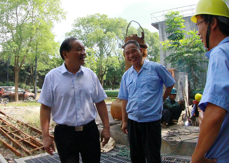 图为首页副总经理、绍兴水处理公司董事长胡张尧在绍兴水处理公司放空泵房导轨更换现场慰问维修人员