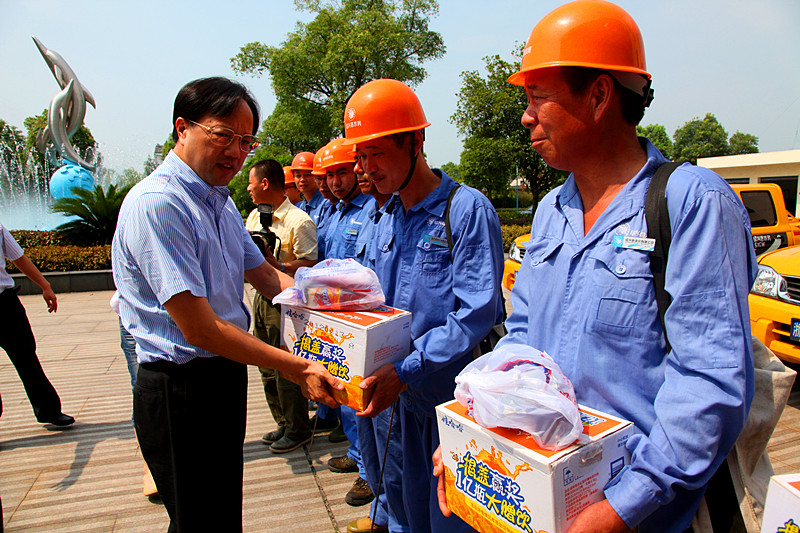 7月12日上午,县委书记何加顺、副县长周树森等领导在水务首页董事长倪阿泉、总经理单宝子等领导陪同下来到公司慰问在高温下作业的供水一线职工,亲手把防暑降温慰问品送到他们手上,并再三叮嘱有关人员落实好夏季高温时段的防暑降温措施,确保一线职工身体健康。