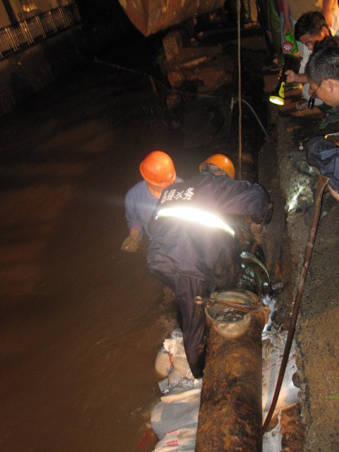21点10分,抢险准备工作全部完毕,供水管道抢修工作正式开始。抢险队员分成两队实施抢修,在不到6米宽的狭长道路上,抢险队员在被湍急洪水冲刷掏空的路基上,冒着随时坍塌的危险,全然不顾个人安危冲锋在前,狂风大雨下,突击队只有一个信念:就是要抢时间,赶进度,尽快让全镇百姓第二天能正常用水!