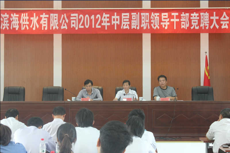 10月9日上午,滨海供水公司在新会议室召开2012年中层副职领导干部竞聘大会,公开选拔办公室、企管部、运行部、工程部、营销部的9个副职岗位。公司中层以上领导干部、职工代表共62人参加会议。此次竞聘,坚持“择优录用、德才兼备、注重实绩”原则,通过公开报名、资格审查,13名候选人在会上作竞聘演讲。经现场民主测评、领导表决等环节的角逐,最终8名工作表现突出、群众基础好的优秀人才脱颖而出。此次竞聘,促进了干部之间的相互交流、学习,同时也使公司更加全面地了解了干部队伍的优缺点,为公司进一步选拔人才提供了参考。