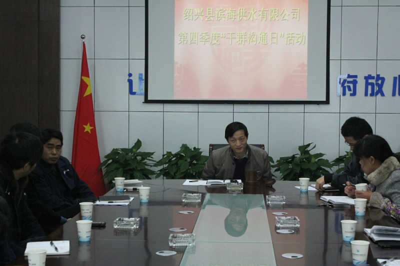 滨海水司第四季度“干群沟通日”活动于12月13日在三楼会议室举行,本次活动围绕基层班组规范化建设这一主题开展座谈。公司领导、各部室负责人、班组长共19人参加座谈。座谈会上,与会人员就如何加强班组管理,更好地发挥基层班组作用,班组工作中的热点难点问题进行“面对面”的沟通交流。
