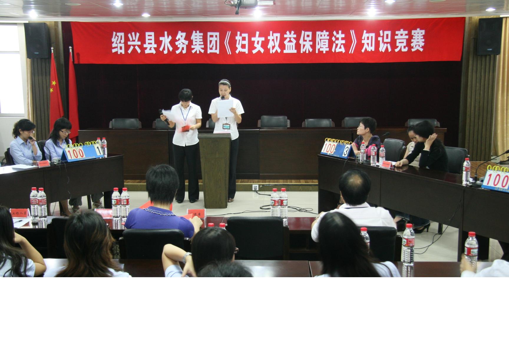 为广泛深入地学习、宣传、贯彻《中华人民共和国妇女权益保障法》,提高广大女职工的法律意识及依法维护自身利益的能力,在“十一”前夕,水务首页妇联举办《中华人民共和国妇女权益保障法》知识竞赛。来自首页机关、供水、排水、水处理公司妇委会等4支女职工代表队参加比赛。本次竞赛以现场答题形式,分个人必答题、小组必答、抢答题和风险题。活动在大家积极踊跃,热情高涨。经过紧张激励的角逐,最终水处理妇委会荣获第一名。