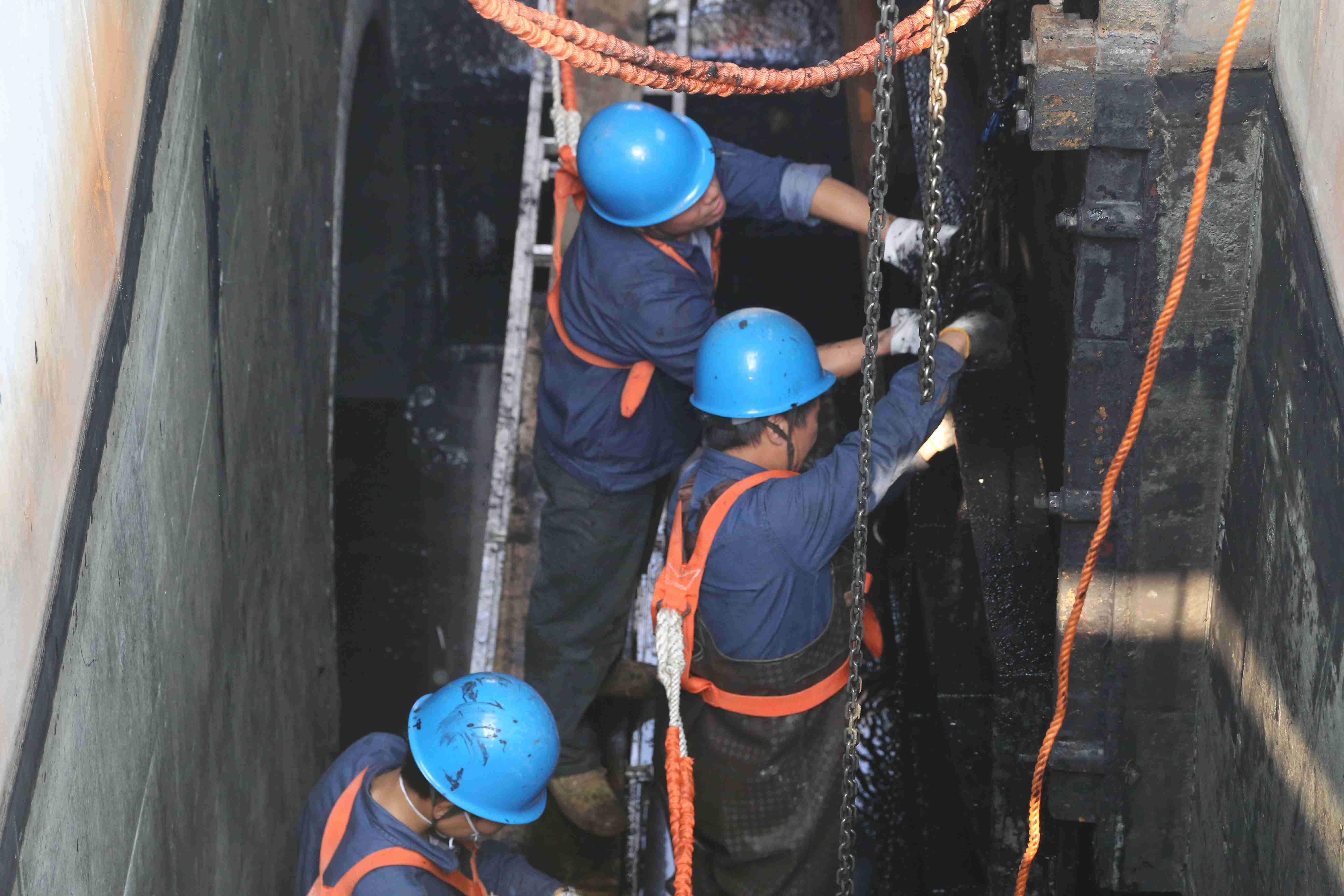 此次维修工作地点全程为混凝池池底,面对池底污泥层厚、空间狭窄等难题,公司前期组织维修人员、安全员等多次进行方案探讨并确定3套维修方案;在维修工作进行过