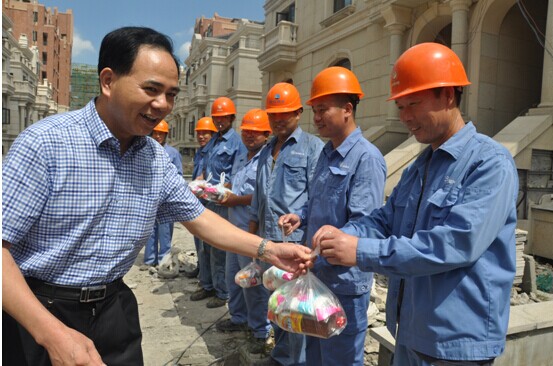7月23日上午,首页公司总经理单宝子在公司董事长谷连森、总经理李叶茂等领导的陪同下,前往柯桥城区湖畔花园和漓渚铁矿供水管网施工现场,慰问坚守岗位的一线职工,为他们送上了消暑饮料及毛巾等防暑用品,并叮嘱大家在高温酷暑下尽量错时作业,注意做好防暑措施。