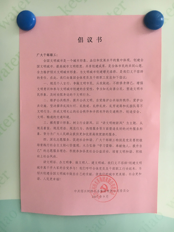 为动员首页全体党员干部职工积极参与创文活动,日前,首页党委发出倡议书,号召全体党员干部职工,积极行动起来,为绍兴创建全国文明城市作出应有的贡献。倡议书提议:首页全体党员干部职工要规范个人言行,争做文明市民;要维护公共秩序,提升公共文明;要擦亮窗口形象,树立行业新风;要深化志愿服务,促进社会和谐。