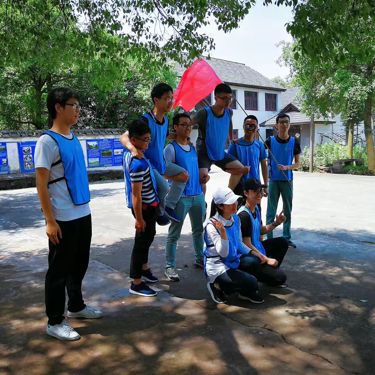 活动中,参加人员被随机分为四队,通过各小组集体讨论,确定了各自的队名、队旗、队标、队歌、口号等。经教练针对性的启发和点评,较圆满的达到了挑战自我、凝聚团队的培训目的。