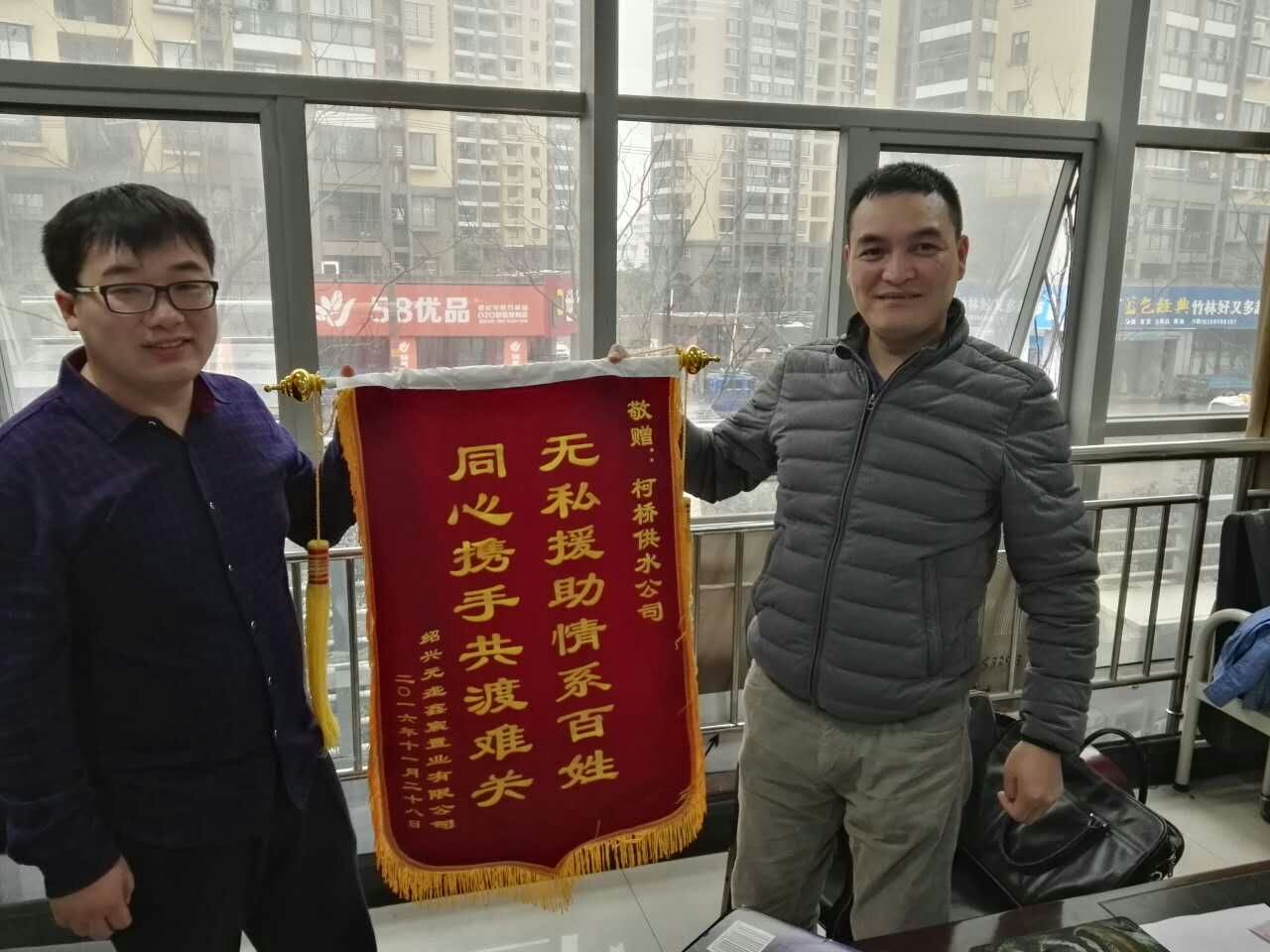 125日,二次供水分公司收到绍兴元垄鑫宸置业有限公司大都会项目负责人专程送来的锦旗,对分公司工作人员为大都会样板房场外给水管道建设提供的真情服务表示赞赏和感谢。